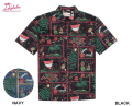 2025年のクリスマスアロハシャツで、ハワイの伝統的なホリデーシーンを遊び心たっぷりにパッチワークしたデザイン。レイ、サーフボード、ヤシの木、フラダンサーなど、ハワイのホリデーシーズンを彩る定番のモチーフがデザインされています。