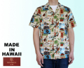 サインボード風のデザインが並ぶPOPなアロハシャツ。