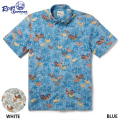 1992年のカテゴリー4のハリケーンが過ぎ去った後、住人たちは鳥小屋や養鶏場の鶏が放し飼いになっているとに気付きました。このアロハシャツにはカウアイ島の名物、放し飼いの鶏たちを描いています。
