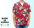 深みのある赤が大人っぽいイメージのレーヨン製アロハシャツ。