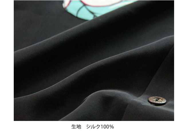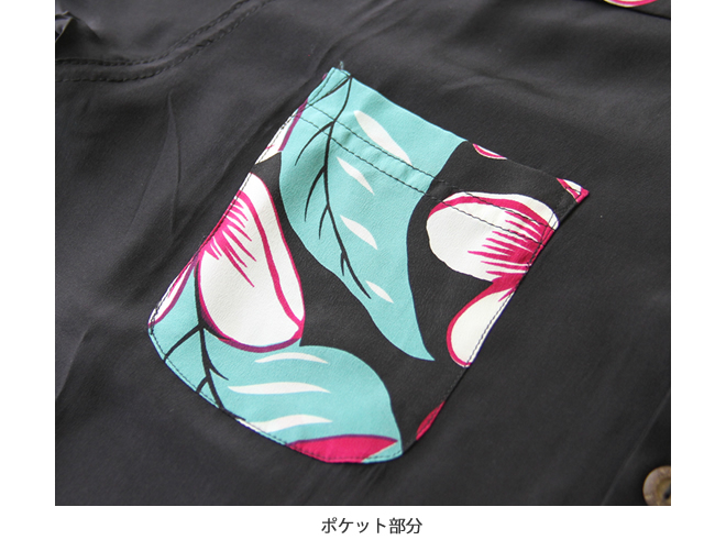 描かれている柄は戦後の空前のハワイブームで本土に定着した楽園のイメージで構成されていて、 黒ベースの本作は鮮やかさを残しつつも、ハワイハワイしてない感が逆に新鮮です。 シブさ全開の大人のアロハシャツです。