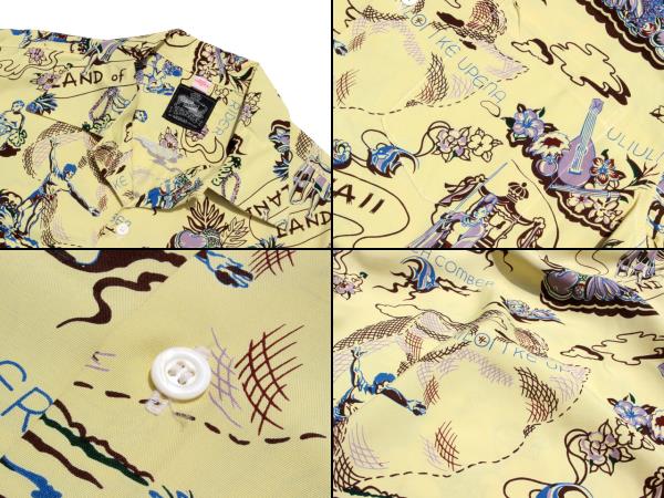 • Kona Bay Hawaii コナベイハワイ アロハシャツ ランドオブアロハ LAND OF ALOHA ハワイ製 レーヨン 黄 イエロー ネイビー 白 ホワイト