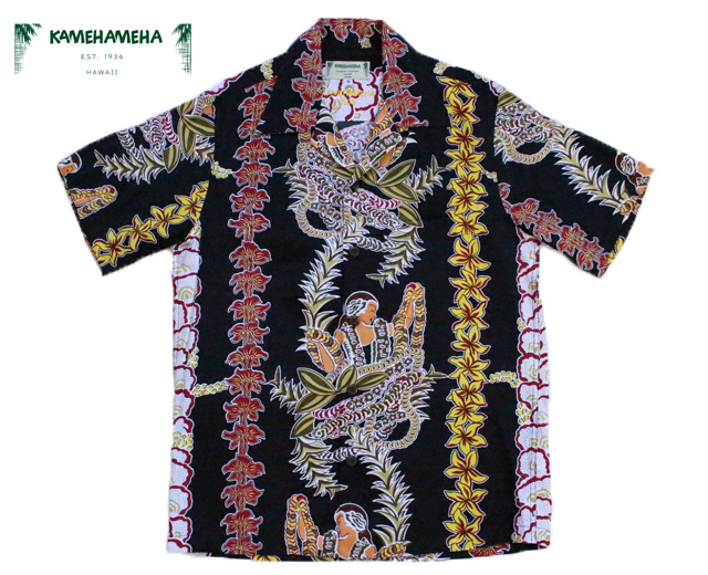 • KAMEHAMEHA カメハメハ アロハシャツ レイレディー レーヨン ハワイ製 黒 ブラック 「LEI LADY」